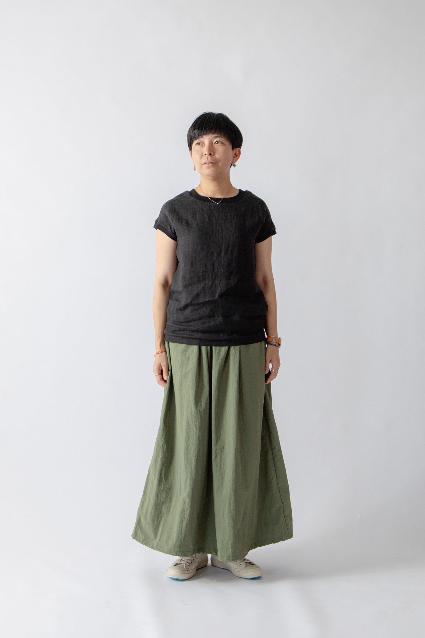 60sフレンチリネン100% 細番手リネンを使用しているので軽くて清涼感があり、フレンチリネン特有の光沢も兼ね備えた麻素材。使い込むほどに肌に馴染み、着心地の良さも大きな特徴。程よく腕を隠してくれるフレンチスリーブで少しゆとりを持たせたシルエット。 新色としてライトグレーをプラスしています。
