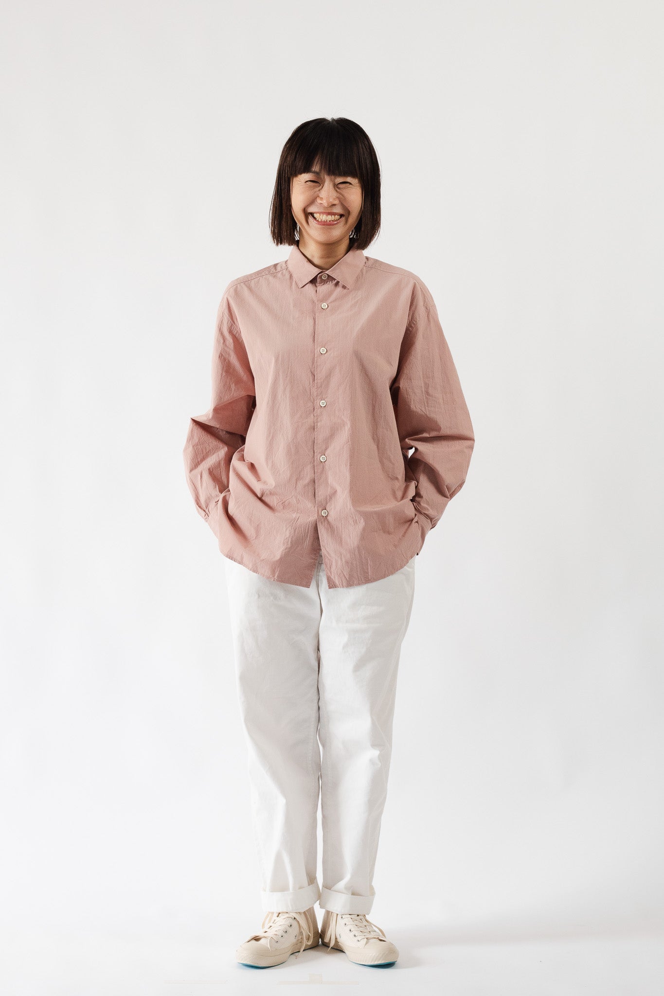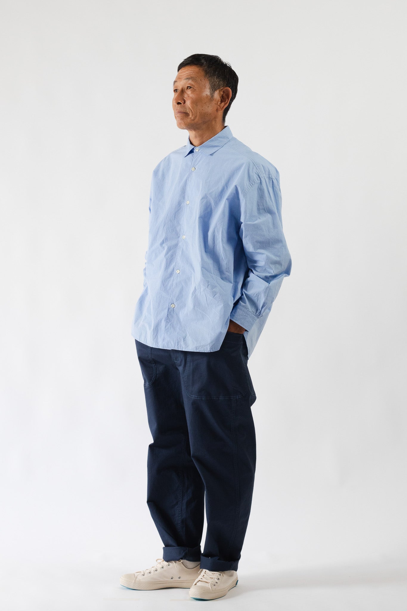 小さめのレギュラーカラーにビッグサイズの見頃で羽織るように着ることができます。カジュアルシャツに適した60番糸を超高密度に織り上げたハリコシのあるタイプライター素材。洗いざらしの風合いに拘ったウォッシュ加工も加えています。