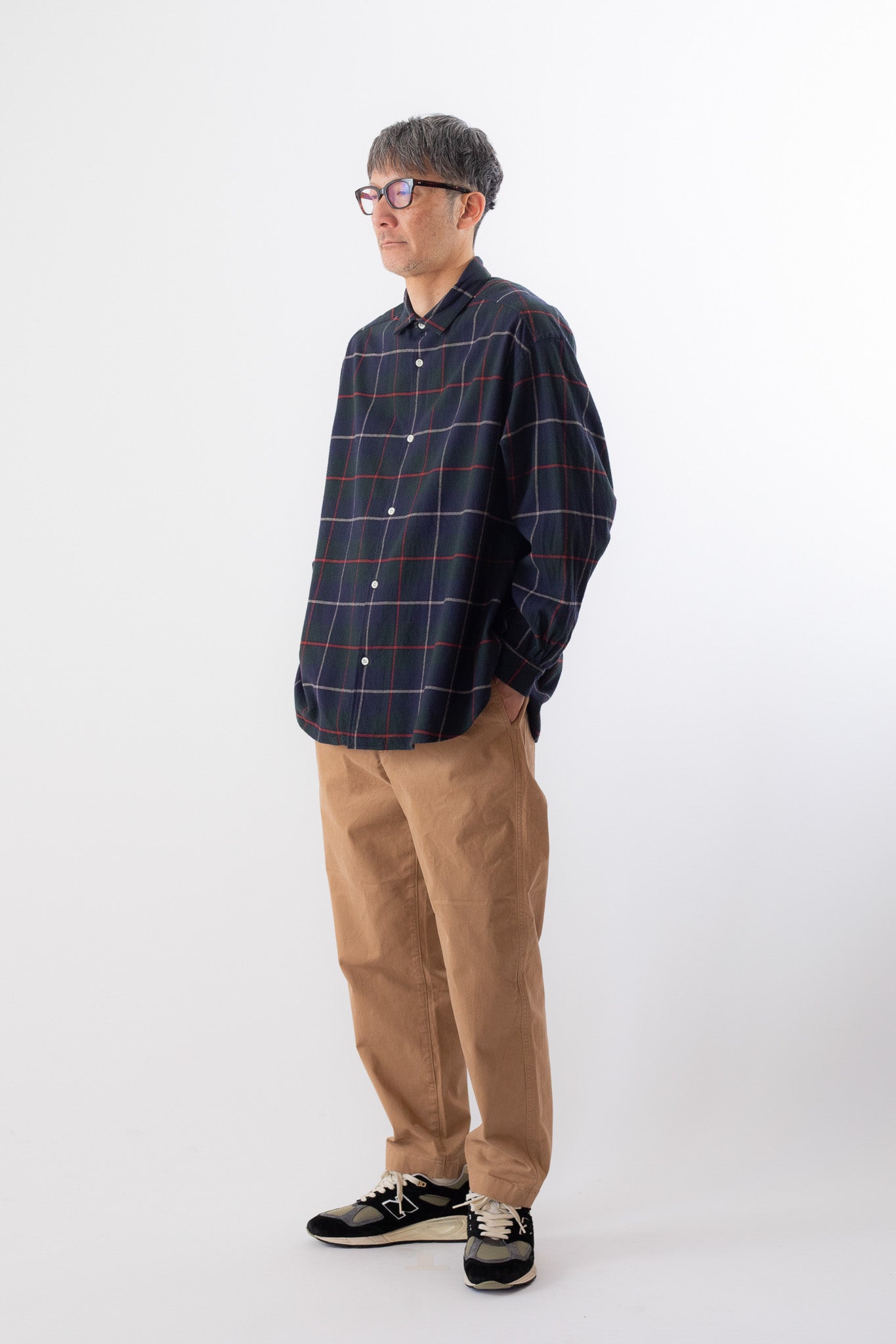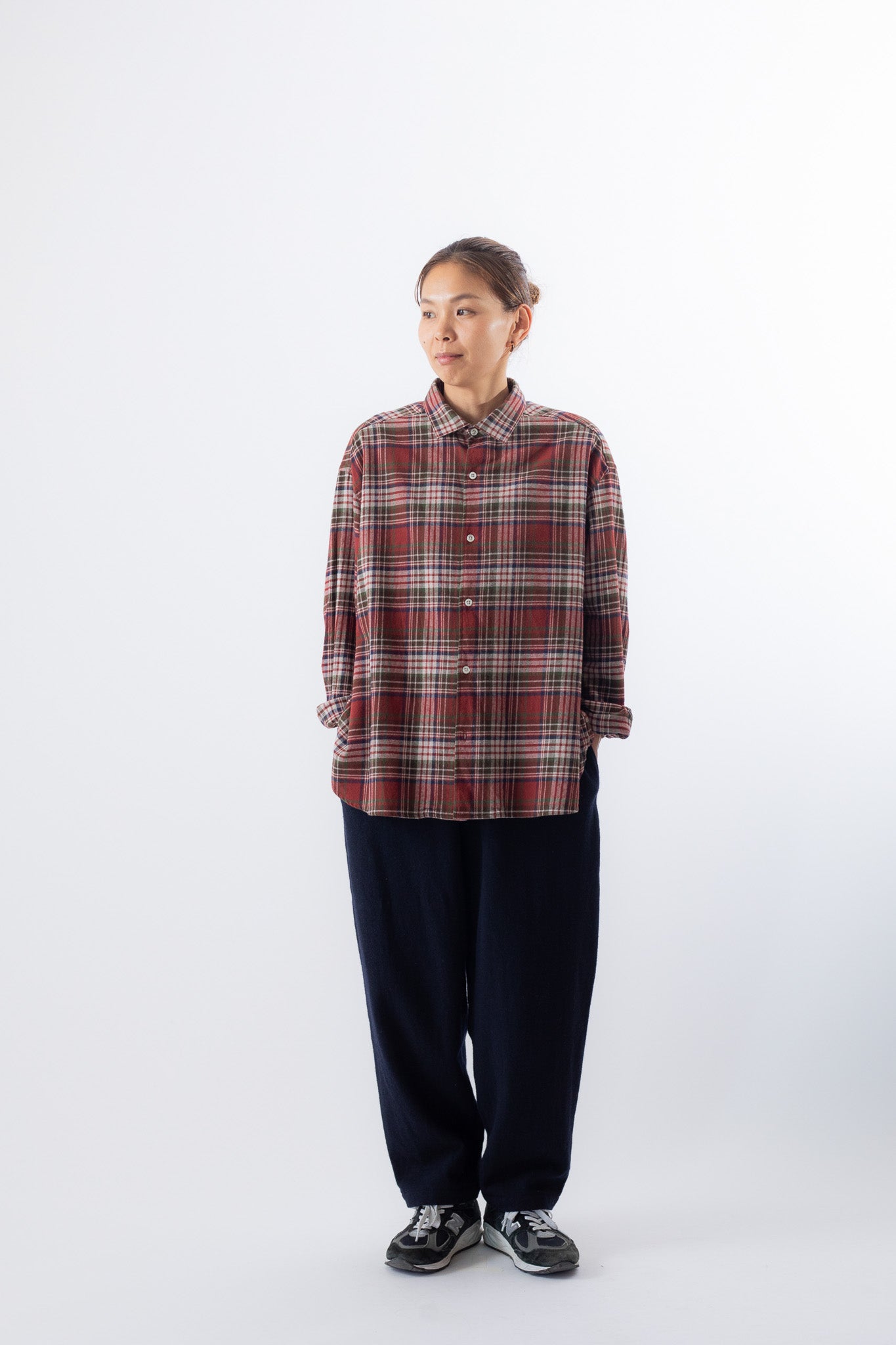 24SSシーズンから継続しているパターンを使った人気のシャツ。 小さめのレギュラーカラーに、ビッグサイズの見頃で羽織るように着てもらえます。 柔らかな両面起毛、コットンヴィエラチェック素材。